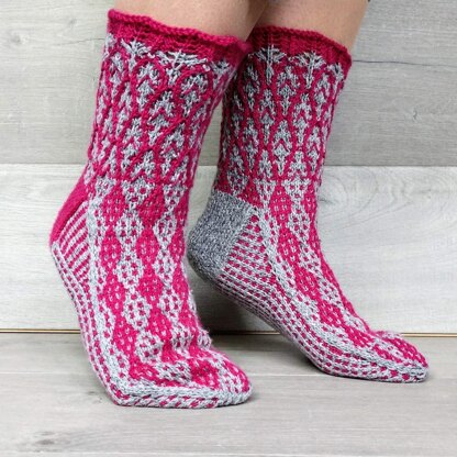 Colourwork socks look intricate, they are warm and cushiony soft. These socks are worked in mosaic knitting technique. Have you tried mosaic knitting? Two coloured mosaic looks amazing and is easier to knit than stranded colourwork. The mosaic pattern knits up using just one of the yarns at a time, no need to carry two yarns all the time like in Fair Isle knitting. Socks are worked from toe up with gusset and reinforced heel. Size refers to sock foot circumference. Socks can be worked on double pointed needles, two circular needles or on other types of needles convenient for the knitter for knitting small circumferences in the round. Using the Two-at-Time method to knit both socks at the same time is not encouraged because of the need to slip stitches from the beginning of the round to the end of the round, and contrary, on some rounds. The pattern uses metric and imperial systems. The pattern is fully charted.