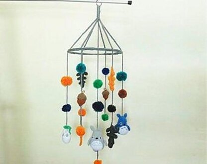 Make your own cute baby mobile with this simple Totoro movie characters crochet pattern. This totoro baby mobile would be the perfect addition to a baby's nursery, room. with totoro characters and acorns and leaves.