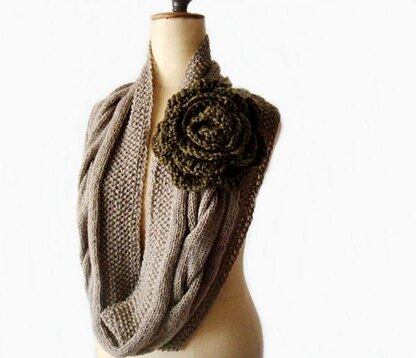 KNITTING + CROCHETING PATTERN. Knitted ifinity loop cowl scarf with one cable and crocheted flower brooch pattern. The pattern is written in American Terms. Difficulty: Easy/ Intermediate. Skills needed: knitting- CO, purl, knit, cable knititng, cast on, crocheting- chain, single, double crochet, tripple (treble) some basic hand sewing skills. Made with light worsted weight yarnor DK, needles US10 (6mm), crochet hook 7mm.