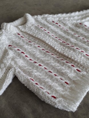 This pattern is for a round neck cardigan with a fold over neckband and has raglan sleeves. This is knitted in a dk yarn and knits up quite quickly. The all over simple cable design is effective and smart and would suit both boys and girls and can be colour coordinated to other items of clothing.