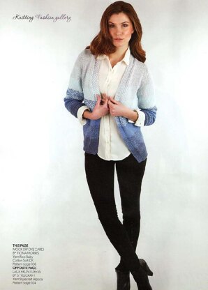 The cardigan is a simple edge to edge v-neck set in sleeve garment. However to achieve the mock dip dyed effect 4 shades of yarn are used and the yarn has been used double throughout to gradually blend from the dark blue through to the silver grey colour.