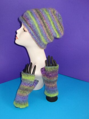 This is my Mohair Slouch and Fingerless Gloves Set knitting pattern. These wonderful fingerless gloves and matching slouch hat can be made using Debbie Bliss Angel Prints yarn. I decided to use 2 balls of yarn knit together on 4 mm needles so it knits up quickly and by deliberately NOT matching the colour pattern of the 2 balls at the beginning you end up with an entirely unique design which will be similar to the one shown here. It is far softer than the stark stripes this yarn normally produces. The knitting pattern provides instructions for 3 sizes S (child), M (teen/small woman) & L (woman). This knitting pattern is now available to buy here .
