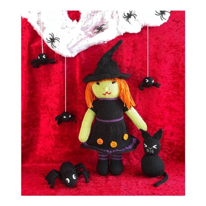 Witch knitted doll pattern and she stands around 33cm (13 inches) tall. The pattern also includes a cat, a large spooky spider and small spiders. The patterns are knit flat and seamed and are very easy to follow with clear instructions and photos. All yarn amounts and step by step instructions are included in the patterns. ** SKILLS NEEDED TO COMPLETE ** HOW TO: Cast on Knit Purl Increase Decrease Cast off ** ITEMS NEEDED ** 2 x 3.25mm (US size 3) knitting needles decorative buttons double knitting yarn (8ply/light worsted) 1 x darning or tapestry needle toy filling pins