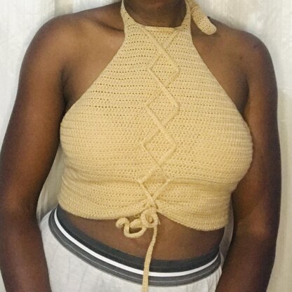 This is a pattern inspired by the top Momo (from k-pop group TWICE) wore in the song Alcohol Free. It is not exactly the same but it is very similar. This top is made to measure so it can be made for anyone. I would wear it at the beach but it can also be worn in other places if you like. I used about 1.5 skeins of 50g yarn for a general size medium, but this differs from person to person.