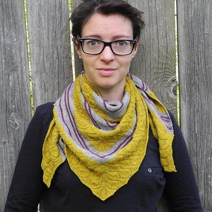 A classical triangular shawl with stripes and lace in three colors. You can adapt the size by using a yarn with a different gauge or simply adding more stripes.