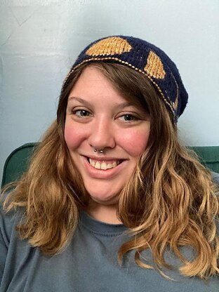 Mond was taken from the German word for "Moon" and since I was a girl, I had a deep love of the moon. So I chose to use the moon phases on this double-sided brim slouchy toque. It is done in DK weight yarn and perfect for all the tie-dyed black souls, witchy women or men, and lovers of nature. In particular the moon.