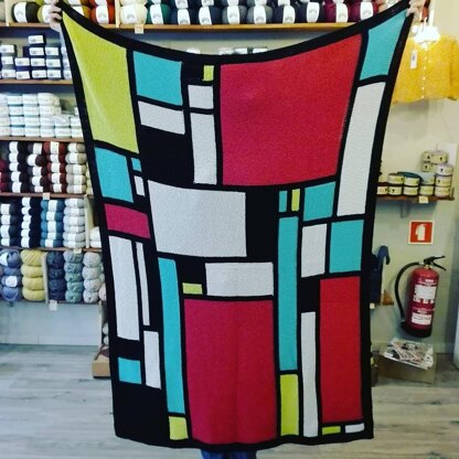 The blanket was inspired by Piet Mondriaan’s later artwork. I’m talking about his geometric artwork where he used not only the three primary colors of blue, red and yellow and the three primary values of black, white & grey but also the two primary directions (horizontal and vertical).