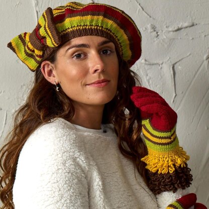 Monica is a matching set of striped beret and gloves. The beret has an optional bow. The gloves feature loop stitch cuffs.