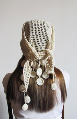 Monisto is a filet kerchief decorated with circle motifs. First, the triangle is worked bottom-up and the motifs added after the main portion is complete.