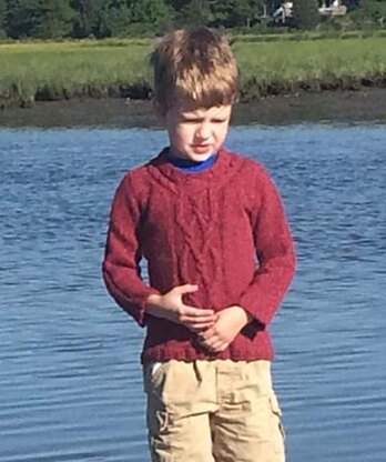 Little boys in intricately cabled sweaters are just adorable in my eyes. With two little boys at home I couldn’t resist designing a cabled sweater for them to wear. The cable patterns in both the front and back split and the cables wind around the collar. A braid winds down the outside of the sleeves. Named for Monomoy Island off of Cape Cod, Massachusetts where the twisting shoals twine like the cables on this sweater.