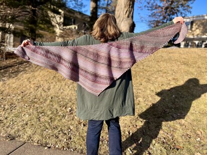 Montrose’s quest for stripes was only aided by a pair of stripe-friendly yarns. Feederbrook Farm’s Entropy DK is a springy, BFL two-ply yarn that adds gentle shifts from color to color. Brooklyn Tweed’s Arbor provided a neutral canvas with the perfect toothy texture. Together, they make a shawl that’s lofty, plush, and stripey as can be.