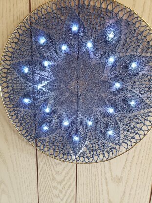 Notions: 14 inch (35.5 cm) macramé ring, 3.3 feet (1 meter) LED copper wired LED 20 light fairy string. 112 size 6/0 glass seed beads.