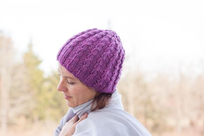 Morgenrot is what we call the pinkish red glow that often is seen spreading across the mountain tops at first light, and this hat is inspired by the vistas on my favorite Slow Stitching retreat in Switzerland on the sunny slopes of the Riederalp. The first rays of light reflected pink off the snow and the rock. First only at the very top, then reaching further down the mountain. The Morgenrot hat features offset graduated mock cables that start higher in the back and on the sides. The pattern subtly and asymmetrically slopes down to a point on the left front. And you won’t need a cable needle, there is a special easy technique that achieves this cabled look!