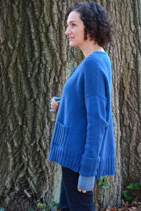 Over-sized and cozy, for easy wear and current day style. This cardigan is worked from the top down, in one piece. Short rows are used to shape the shoulders. The sleeves are picked up at the armholes and knit from the top down. The neck and front bands are picked up and worked at the end.