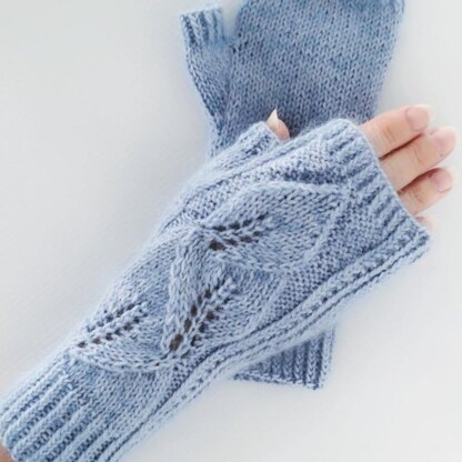 Morning Frost Mitts have a graceful central lace pattern, framed by a delicate twisted rib at the cuff and fingertips. The mitts are knit in the round from the cuff. Thumb stitches are knit in the round and finished with the same twisted rib.