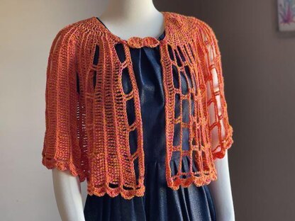 Through the use of extended and tall stitches a unique shape is created that drapes wonderfuully across the shoulders. Show off both sides by wearing it like a cape with an option to keep it secure with a brooch (instructions included), or show off just one side by lacing the two pieces together to be worn as a short poncho.