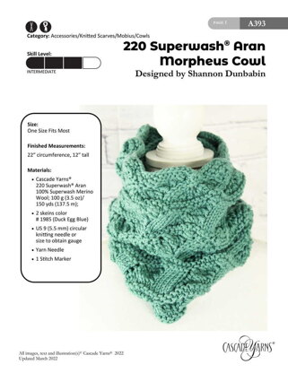 Morpheus Cowl in Cascade Yarns 220 Superwash Aran - A393 - Downloadable PDF is a free Intermediate Knitting pattern by Shannon Dunbabin, available as a Downloadable PDF and includes instructions in English. Super fun to make, this pattern could be your next masterpiece!