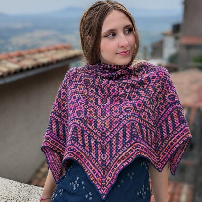 Mosaicoscope is a mosaic shawl worked “on the bias” creating the illusion of reflected shapes inside a kaleidoscope. Mosaic Colorwork is the easiest way to achieve stunning results just slipping a stitch here and there and managing only one color at a time. Here this technique plays with increases and decreases strategically placed to create peaks and valleys and to trick the eye with diagonal lines that actually don’t exist.