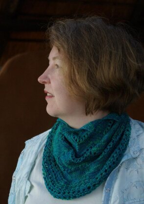 This cowl is inspired by the tumbling waters and bright sunlit spray of the falls. It begins with a close-fitting, pointed neckline, and continues in gradually softening waves to a foamy eyelet border.