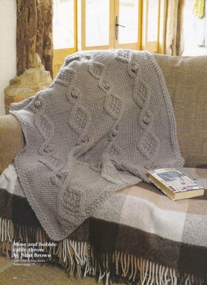 This is a pattern for Moss and Bobble Cable Throw, originally published in Knitting magazine. It is in a chunky yarn, with a diamond moss and bobble cable, and moss stitch edges. Photo Laurel Guilfoyle for Knitting magazine.