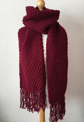 Scarf knitted in Moss stitch with fringe. Pattern includes instructions for both.