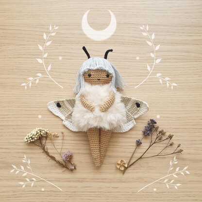 As the sun sets and darkness falls, a tiny moth sprite awakens, drawn by the moon's serene glow. With her patterned wings and a warm fluffy coat, she ventures into the night sky. Mesmerized by the moon's gentle radiance, she flutters closer. Bathed in the soft moonlight, the little sprite knows she has found her place under the night sky, bringing enchantment wherever she goes. To create your moth sprite you will need: - Crochet hook 2.00mm - Crochet hook 5.00mm - Cotton fingering (4 ply) yarn (up to 5 colours) - DMC Samara Yarn (faux fur) - Stuffing - Black safety eyes (5mm) - Buttons x 2 (1mm in diameter, same colour as fur yarn) - Stitch markers/scrap yarn for stitch count - Pointy yarn needle - Sewing needle - Scissors - Sewing pins - Thread for sewing buttons - Piece of scrap cardboard