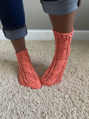 These socks are knit from the toe up making them easy to adjust for length. The lace pattern and ribbing means it will fit from regular to wide widths. And the princess sole with it's knit side on the inside of the sock means that it'll be smooth and comfy for the wearer. These are loose fitting and easy to slide off and on. The pattern gives instructions for an anklet or calf length as well a choice of a feminine lace cuff or for a more standard ribbed cuff.