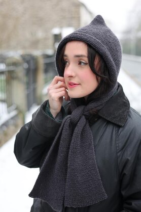 This quintessential vintage pixie hood is knitted flat in two separate pieces; the hood knitted in one piece with shaping added at the centre back for a more comfortable fit, and also a separate scarf knitted in a rectangular strip. Once knitted, the centre back seam of the hood is sewn up and then the front of the hood is folded back providing an attractive frame to the face. The scarf is then sewn in place over the bottom edge of the hood.