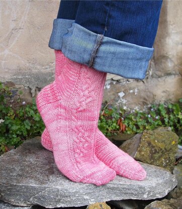 This sock pattern contains mirrored cables on left and right. They are named for a lovely little town in Maryland called Mount Airy.