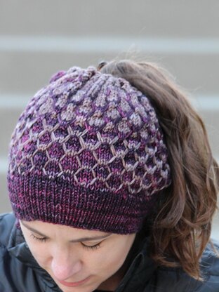 This cowl is knit bottom up starting with k1, p1 ribbing. A quilted stitch pattern and color changes transition colors throughout. At the top a simple eyelet lace row is threaded with a removable i-cord to cinch up the top when used as a hat.