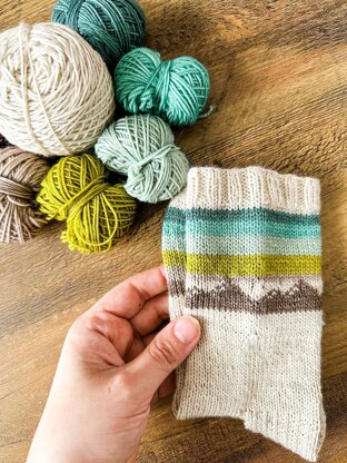 *Mountain Meadow socks was created with the Mountain Meadow sock set from Moonglow Yarn co. It's knit top down with fun stripes and colorwork. This is great for intermediate colorwork knitters.
