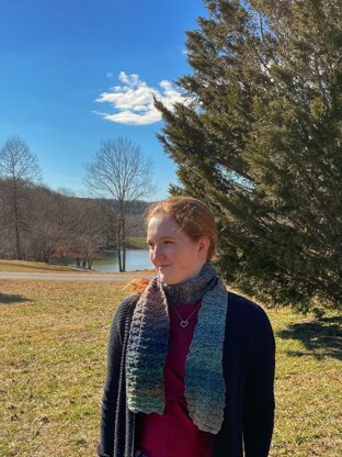The subtle wavy pattern throughout the scarf reminds me of the rolling hills near Black Mountain, although it would look great in a blue yarn for an ocean theme.