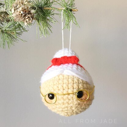 Mrs. Claus is about 9 cm (3,5”) high, with worsted weight 100% acrylic yarn and a 3.50 mm crochet hook (US size E/4).