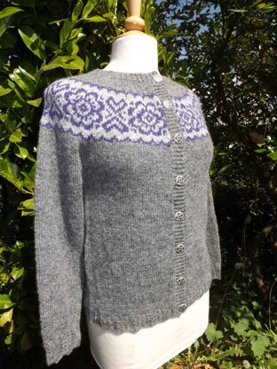 This is a cardigan knitted back and forth from the bottom edge and up with a round yoke and slightly curved edges at the bottom of the body and sleeves created by a lace rib. The yoke has a very nice 2 colored pattern worked in stranded knitting with a traditional Scandinavian flower pattern. This pattern is made for at yarn with a gauge of 22 stitches per 10 centimeters.