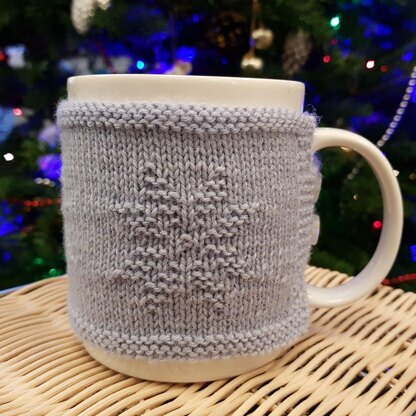 The pattern includes written instructions (stitch by stitch and row by row) and charts for knitting mug cozy with three snowflakes.