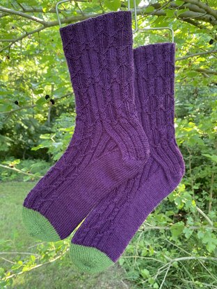 Mulberry socks incorporate cables that are reminiscent of mulberries and lots of ribbing for stretchy, accommodating socks; even the gussets have ribbing! They are knit cuff-down and feature a reinforced slipped stitch heel flap that flows organically from the cables.