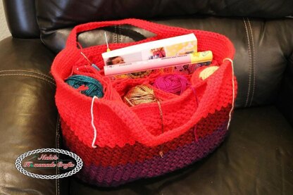 I used 4 different colors of Caron One Pound yarn (yardage above is an estimate of the total of all 4 colors). I love the look of it. The Bag also has dividers (even with pockets) inside that can be removed or rearranged. So cool. That gives you hundreds of possibilities what to use this bag for.
