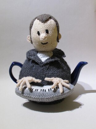 The music man tea cosy plays his keyboard as he keeps the teapot hot. Dressed in a dark grey jacket he has a bit of a reseeding hair line and long piano fingers.