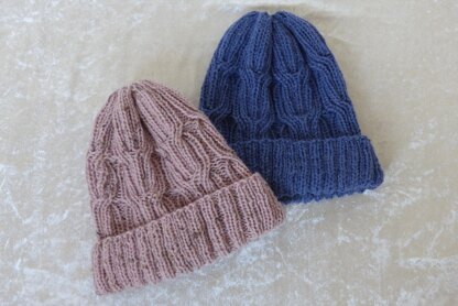 Durch das Bündchenmuster bleibt die Mütze schön in Form und passt sich gut an. Ein Zopfmuster unterbricht das Bündchenmuster.