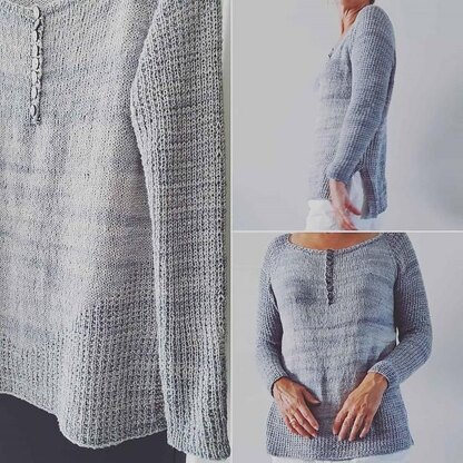 This top down sweater has a Henley styled neckline, side seam splits and stitch pattern detailing on sleeves and lower body.