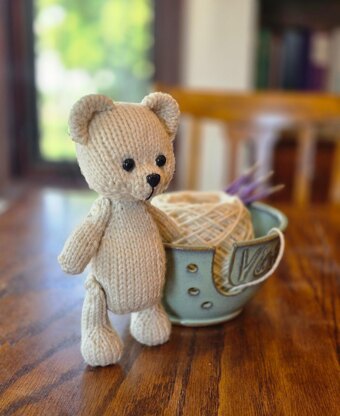 The bear is constructed using Aran/medium weight yarn and US 5 (3.75mm) DPNs. It measures 9” tall standing and 6.5” sitting.
