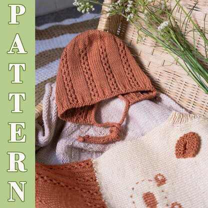 Bonnet is worked flat in one-piece. It’s made front to back and decorated with fantasy patterns. The bonnet can be fixed on the baby head with two knitted cords (i-cords), connected to it during knitting.