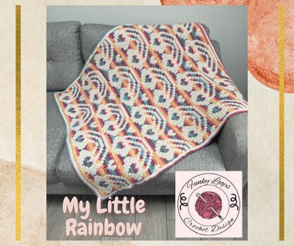 The blanket measures approximately 105 cm x 85 cm. But can be made any size by adding more repeats. It features Rainbow and Heart motifs. It is made using DK Yarn - in this instance Hayfield Spirit DK Sundown 3 x 100g and Hayfield Bonus DK Cream 4 x 100g.