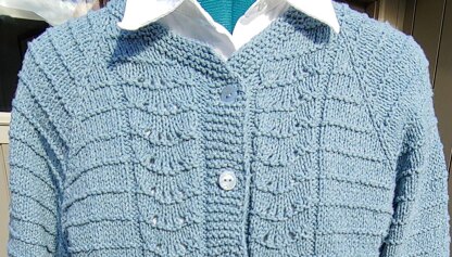 This cardigan is knit from the top down with raglan sleeves and no seams. The Feather & Fan pattern along the fronts and on the back is a 6-row repeat with a garter stitch across the 6th row. Techniques used are: YO, K2tog and SSK. Raglan increases are made using LLI and RLI. You can find many “youtube” tutorials that provide instructions for these increases.