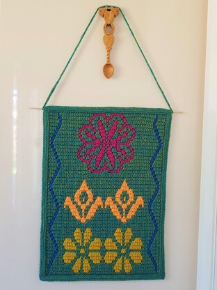 The inspiration for the designs in this cute wall hanging came from ancient tapestries. The pattern is for mosaic overlay crochet and contains written instructions as well as charts marked with Xs. There are additional charts for the 3 flowers, without the vines, that can be used for other projects like blankets, bags, table runners or scarves etc. If you have not done mosaic overlay crochet before, the pattern includes general instructions on this method, however, there are a number of videos on YouTube to help you out.