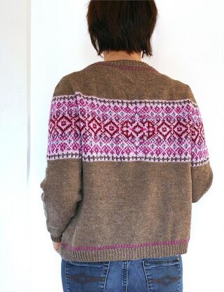 NANI is worked seamlessly in the round in one piece from the top-down using elements of the contiguous method. To avoid purling the stranded part, steek stitches are added and cut later Additional body increases are worked in the upper body to improve the fit. After the sleeves are divided, the lower body is optionally worked straight down or with some slight waist shaping. Right above the hem, the cuffs and below the neckband a tiny three-row pattern adds some extra.