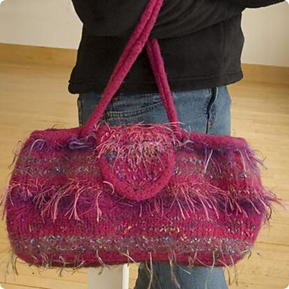 Nastasha Start with a basic wool yarn and add any number and type of novelty or accent yarns to create your own fabulous felted bag. The fuchsia color is optional! Size: 14" wide x 8" high x 3" deep felted Gauge: 2.5 sts/inch on #13 needles