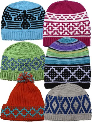 Native American Hats, #617. Popular Native American themes are highlighted in these 6 different hats. Designs are formed by cleverly placed dropped dc stitches worked in front loop of stitch 2 rnds below. All color changes are done at beginning of rnds so you are only working with one color at a time. Make them for your family using worsted, DK or sport weight yarn. Written instructions included plus optional graphs. Easy to intermediate skill. See our website for a video how-to tutorial showing just how easy the dropped dc stitch is.