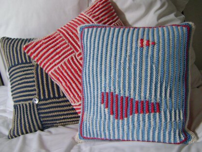 This nautical themed pillow is designed to suit those new to shadow knitting. The pattern provides detailed instructions in both written and charted form thus allowing the knitter to choose their preferred format. Simple directions give the additional option of working a fabric (or knitted) back. (Yarn quantities given are for fabric backed cushion, see additional information below for knit backed cushion.) For fabric backed cushion you will need: Coordinating fabric 52 cm x 33 cm, sewing needle, thread & tape measure. For knit backed cushion: Yarn quantities for the back panel will depend on your choice of colour. If working to the required gauge in stripes of MC, CC1 and CC2 you will need one additional ball of MC and CC1 to complete a matching Back. However, if you choose to work the Back in CC2 only, you should require only one additional ball of this shade.