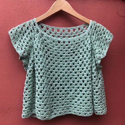 This top is seamless and is worked from the neck downwards, so you can try it on as you go. It is mainly worked in the round with a few rows added to the back to provide neck shaping.
